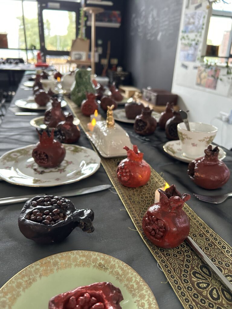 Pomegranates are a symbolic fruit to many cultures and societies. For the Ancient Greeks, they represented temptation – a moment when Persephone had accidentally bound herself to the Underworld upon eating six seeds. For this, she had to spend six months in the Underworld where the world withered away; the remaining six she would return to her mother and life would begin to bloom again. This is what Ancient Greeks believed created the Seasons of Autumn, Winter, Spring and Summer. Through still-life sketching, we studied real pomegranates: some whole, some halved. We then moved onto creating these out of plasticine and using different tools to help gouge out sections and cross-hatch the crown on top. Finally, we committed to clay and created full and halved ‘poms’, eventually painting and glazing them. The final task was to create a dinner table, fit for the King of the Underworld, where the pomegranates would lavishly lay. Well done, 5S!